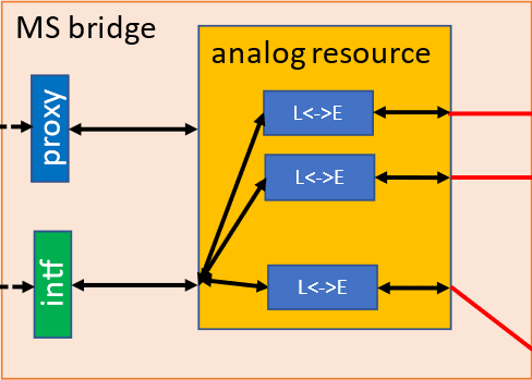 A third option for the doubler switch is adding a proxy to the MS bridge to control the conversion between digital and electrical, while the UVC remains unchanged. Here the analog resource is a custom written module, which via the proxy allows full control of the D2A/A2D boundary.